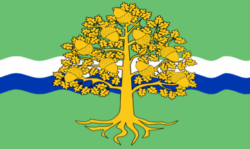 The Banner of Arms of the Nottinghamshire County Council has a large stylized gold oak tree representing Sherwood Forest defacing a wavy blue and white horizontal wave pattern representing the Trent River that runs across its green field.