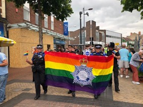 A special "Rainbow" variant of the Nottinghamshire Police flag is displayed to show the Nottinghamshire Police's commitment to supporting the Lesbian, Gay, Bisexual and Trans (LGBT+) community during the annual high Pride festival.