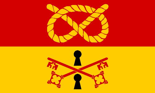 The flag features several references to the towns traditional industry of lock and key-making. The field itself is divided between a red hoist and a blue centre and fly by a vertical embattled line, the pattern of which symbolises the pins of locking mechanisms. In the hoist are three padlocks and the centre of the design has crossed keys with a crown above them, the crown recalling how Queen Elizabeth I granted permission to the town to manufacture royal locks and the towns subsequent status as a king of lock-making. The colours of blue, red and gold were drawn from the arms of the former Willenhall Urban District Council.