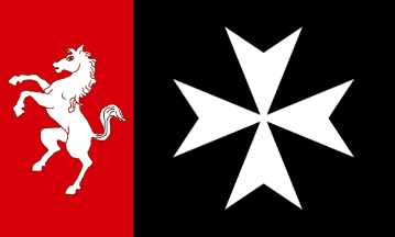 The Lathe of Sutton-at-Hone bears a flag with a white Jerusalem cross against a black background. The symbol is associated with this locality because of the presence of St. John's Jerusalem Preceptory there. This was established in 1199 as a Commandry of the Knights Hospitaller of the Order of Saint John of Jerusalem. The building was given to the nation in 1943 by Sir Stephen Tallents, and was open to the public twice a week in the 1950's. The emblem of the order of Saint John and the Knights Hospitaller, known as a Maltese cross because the headquarters of the order is located on the island and it is commonly seen there, is a white eight-pointed cross having the form of four "V"-shaped elements, each joining the others at its "vertex", leaving the other two tips spread outward symmetrically. Consequently organisations in the Lathe of Sutton-at-Hone make use of the cross, including for example a local parish council and the local football club. The cross is also present on the civic arms of Dartford, on the necks of the two supporters bearing the shield, where it is white against a red and black field. A white cross against a red background, as seen in the above image, remains the specific colour scheme used by the order of Saint John but another common realisation for this device places the white cross against a black background and this is the colour scheme utilised for the lathe flag, which is seen as particularly dramatic