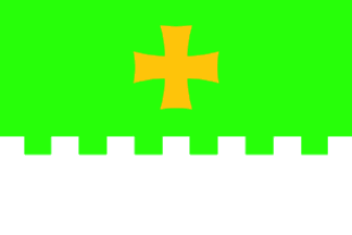 The flag of Terjola is horizontally divided green-white (6:5) embattled, with a yellow cross patty in the center of the green stripe.