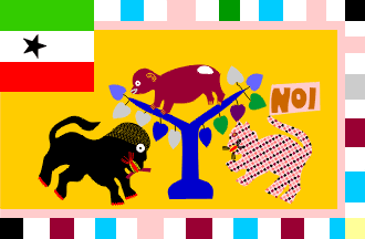 Squarish tricolor canton with horizontal stripes of light green, white and red, with a black five-pointed star pointing to the fly. This is obviously the Ghanaian national flag as of 1964-1966 (though turned upside down), which allows for a relatively narrow dating of this flag. The star is set off to the hoist which, along with the square canton for a 2:3 flag, may imply that the canton was originally meant to cover also the are covered by the (white) hoist sleeve.