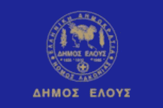 The flag of Elos (Kokkonis website) was blue with the municipal seal in the middle and the words "ΔΗΜΟΣ ΕΛΟΥΣ" beneath in gold.