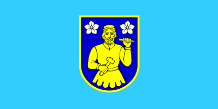 The flag (photo) is in proportions 1:2, light blue with the coat of arms, bordered yellow, in the middle.