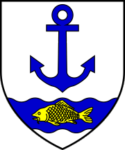 The coat of arms is prescribed as "Argent an anchor azure and in the base a fish (carp) or on a fess of the second". The fess is not mentioned as wavy.