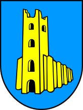 The coat of arms is "Azure a ruined church or".