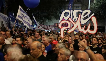 Two flags paraded by the progressive Israel "Peace Now" movement in 2017 in Tel Aviv, Israel to mark 50 years of Israeli occupation of "Palestinian territories" in the West Bank / Judea & Samaria; Credit: Moti Milrod. The blue slogan in the white/blue flag that mimics the Israel national flag reads in Hebrew: "Shalom" (or "Peace") which replaces the regular Star of David or the "Magen David" in the middle white stripe. The white/black/red flag reads "Shalom/Peace" in black and in red "achshav" (now), resulting with the overall slogan of: "Shalom Achshav" or "Peace Now". (Source: https://www.haaretz.com)