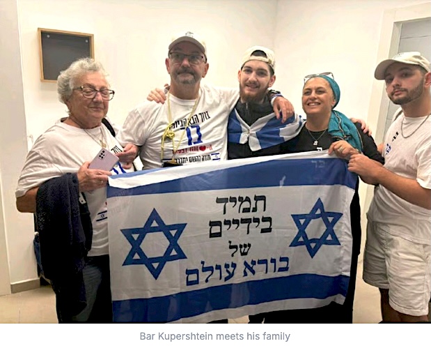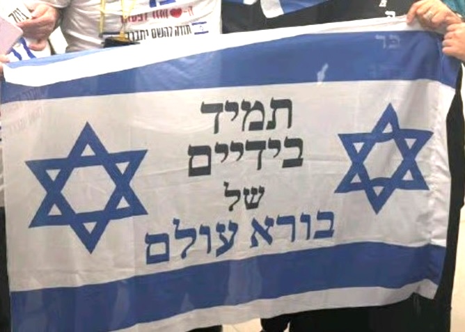 On October 13, 2025, 20 Israeli men, including two IDF soldiers, were released by Hamas into the custody of the Red Cross and returned to Israel, among them Bar Kupershtein (an IDF soldier on leave when taken captive), who holds an Israeli flag with a Magen David on each side, accompanied by the following inscription: "בורא עולם | של | בידיים | תמיד" (Always | in the hands | of | the creator of the world). (sources: jfeed.com, france24.com)