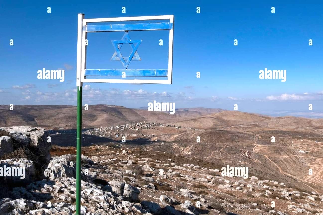 Caption: The Israeli flag made from steel placed at Matan Lookout overlooking the hills of Samaria also known as Nablus Mountains located on the Gidonim ridge (a hilltop on which several Jewish settlements are located), above the Israeli settlement of Itamar in the West Bank [Judea and Samaria]. (source)