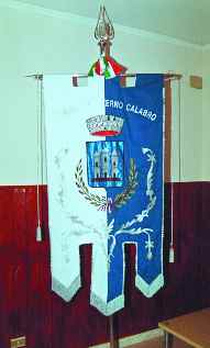 From <www.comune.paternocalabro.cs.it>: " Lo Stemma: Di colore azzurro ha in primo piano tre campanili di colore argento a due palchi murati e chiusi di nero. Quella centrale č pių alta. Tutte e tre sono coperti da una calotta semisferica con in alto una croce e poggiano su tre gradoni di colore argento. Ornamenti esteriori da comune.Drappo partito di bianco e azzurro riccamente ornato con ricami argentati e caricato dello stemma. Iscrizione centrata in argento: Comune di Paterno Calabro. Frange e cordoni argentati. Cravatta e nastri tricolorati dai colori nazionali."