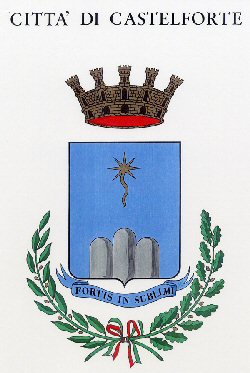 "STEMMA: di azzurro, ai tre colli all'italiana, fondati in punta, di argento, uniti, quello centrale pił alto e pił largo, sormontati dalla cometa d'oro di otto raggi, il raggio inferiore inglobato nella coda ondeggiante in palo. Sotto lo scudo, su lista bifida e svolazzante di azzurro, il motto, in lettere maiuscole di nero, FORTIS IN SUBLIMI. Ornamenti esteriori da Città.