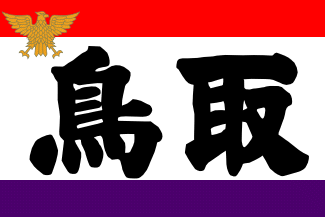 The red, white and purple horizontal striped flag has yellow bird at the canton and the prefecture kanji name 鳥取 Tottori horizontally in black in the center. The flag was in use in Kokutai before the prefecture official flag was adopted in 1968.