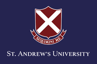 Located in Izumi City Osaka Prefecture and established in 1959. The embroidered ceremonial flag has dark red background with a gold and silver emblem and horizontally written gold English university name in gold fringe. The university flag has navy blue background with a dark red and white emblem and white English university name written horizontally. The university emblem is designed after St. Andrew, one of the first disciples of Jesus Christ. The "Andrew's Cross" (St. Andrew's X-shaped cross) is a symbol of the great life of Andrew, who was martyred for defending the teachings of Jesus. SEQUIMINI ME" (Latin for "follow me") are the words to which André was called when he met Jesus, and thus the university emblem indicates that it will live by the Christian spirit of "freedom and love" to the end, as André did.