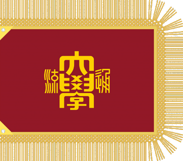 Located in Ryugaski City Ibaraki Prefecture and established in 1965. The embroidered ceremonial flag has dark red background with a gold emblem in gold fringe. The university flag has red background with a white emblem. The university emblem is a graphic representation of the kanji words 流通大學 University of Distribution. This emblem was adopted in 1965, when the university was founded with a donation from Nippon Express Co., Ltd. for the purpose of promoting research and education related to distribution economics in general.
