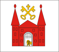 Znamierowski: The World Encyclopedia of Flags [zna00], shows several interesting flags of the port cities of northern Europe.  These are derived from gonfalons, originally red in color.  The flags, in a banner form, were flown from the stern of the vessels, the mast carrying the gonfalon of the colors. Here is the flag of Riga, in the 14th century .