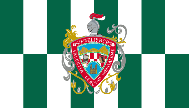 This is a Gothic shield with a red border charged with the abbreviate City's colonial name in Old Spanish, and the motto: Courage, Loyalty, and Hospitality. It was proposed by Francisco R. Almada, León Barri Paredes and José Carlos Ch´vez, and aproved officialy on September 30, 1941. Within the shield there are three parts: the first one in the chief, bears a mine winch, an old aqueduct, and a mezquite tree; the second in the center, is checkered in white and red, and has the heads of a Spanish soldier and a Tarahumara woman's, both looking towards the center; in the bottom, the facade (front) of the Cathedral of Chihuahua. The quarters are separated by laurel branches. In the top, a silver helm and mantling.