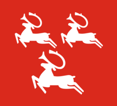 Official blazon in Norwegian: "På rød bunn tre springende hvite rein."