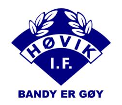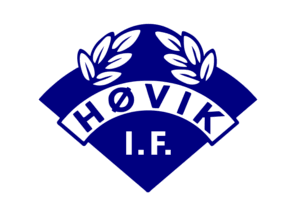 The flags of Høvik IF (Høvik Idrettsforening) from Høvik in Bærum Municipality are white or blue and white striped with the badge centered.