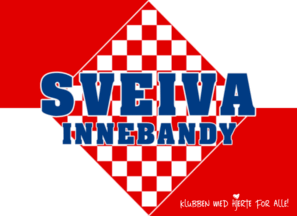 The flag of Sveiva IBK (Sveiva Innebandyklubb) from Oslo is quartered red and white with the name in blue over a chequered square on point. Sveiva is in northeast Oslo, close to the road in the direction of Mjøsa. Innebandy is an indoor relative of ice hockey.