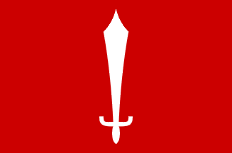 The flag is dark red, approx. 2:3, with a large white sword centered on it. This is symmetrical, pointing upwards and has a wide blade, widening to a diamond tip with three points; relatively small hilt and handle.