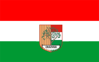 Coat of Arms: per pale a) three fesses gules, argent, vert; b) or six pales brown; over all a tree of natural colors; in base a saw argent charged with "OLSZYNA" noir.