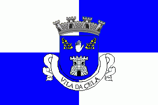 Shield Azure, a tower embattled Argent masoned Sable with port and windows Sable, in chief a hand Argent flanked by two branches of apple tree Or. Mural crown Argent with four visible towers (town rank) and white scroll with inscription in black initials "VILA DA CELA".