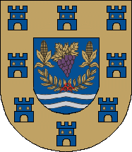 The coat of arms is 100% typical: 4-towered mural crown (town rank), scroll reading "CONCELHO DE BAIÃO" and shield. The shield is blue with a wide golden bordure according to my sources , and is charged with a bunch of grapes surrounded by a laurel all in the same colour as the bordure, below 3 silver-blue-silver wavy lines. The bordure is charged with eight blue castles with port and windows in the same colour as the border, disposed as the castles of the portuguese coat of arms.