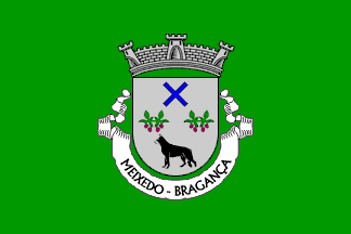 Shield Argent, two plum tree branches Vert fruited Purpure set in fess, and in chief a saltire couped Azure, in base a dog passant Sable emphasized Argent. Mural crown Argent with three visible towers (village rank) and white scroll reading in black upper case letters "MEIXEDO - BRAGANÇA".
