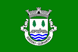 Shield Argent, a bridge Argent masoned Sable, in chief two pine cones Vert set in fess, in base three barrulets wavy Azure. Mural crown Argent with three visible towers (village rank) and white scroll with inscription in black capitals "SERZEDO - GUIMARÃES". Ralf Hartemink's webpage and this webpage are both describing the bridge in different colours, I followed the photo given in Guimarães municipal webpage.