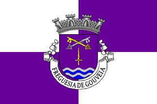 Shield Purple a sword Or, in chief two keys saltirewise Or and Argent tied Argent, base wavy Argent and Azure of four. Mural crown Argent with four visible towers (village rank) and white scroll reading in black upper case serifed letters "FREGUESIA DE GOUVEIA".