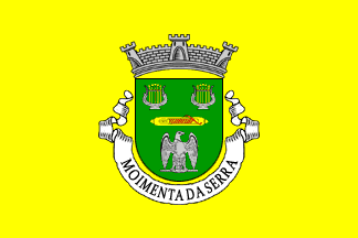 animated Gules sinister facing and perched on a baton Argent. Mural crown Argent with three visible towers (village rank) and white scroll reading in black upper case serifed letters "MOIMENTA DA SERRA".