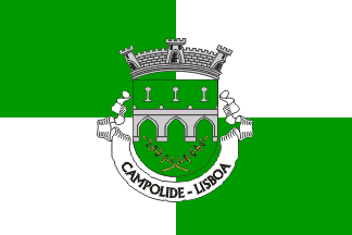 The arms are Vert a three-arch aqueduct Argent Masoned Sable. in chief three rail profiles Argent, in base two olive branches Or fruited Sable set per saltire. Mural crown Argent with three visible towers (village rank) and white scroll reading in black upper case letters "CAMPOLIDE - LISBOA".