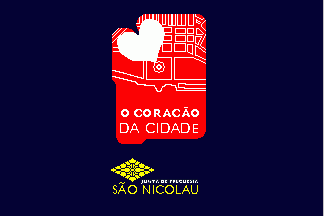 It is an untypical Portuguese communal flag, with a very dark blue field. In centre a red filing card containing some kind of map painted by white lines. From the upper hoist corner of the card a white, bendy heart is pointing to a white roundel in the map, in base of the card is an inscription in white initials "O CORAÇÃO" (1st line) "DE CIDADE" (2nd line, bigger), which means "the city's heart". Beneath the card is a golden lying lozenge with a dark blue floral pattern, accompanied by an inscription in initials "JUNTA DE FREGUESIA DE" (1st line, white, tiny) "SÃO NICOLAU" (2nd line, golden).