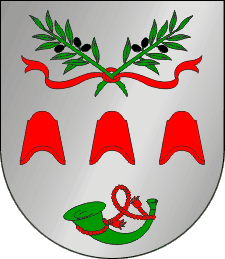 The arms are Argent three roof tiles Gules set in fess, in chief two olive branches Vert fruited Sable and tied Gules per saltire, in base a postal horn Vert cordoned Gules. Mural crown Argent with three visible towers (village rank) and white scroll reading in black upper case letters "ATENOR".