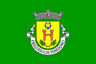 Shield Or, a towered gate Gules masoned Argent, in chief a lyre Azure stringed Argent, in base two chestnut branches Vert fruited Proper with the tips of their stems crossed per saltire. Mural crown Argent with three visible towers (village rank) and white scroll with inscription in black capitals "FREGUESIA DE PENEDONO"