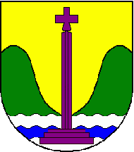Shield Or with base wavy of Argent and Azure, issuant from base a valley Vert, over all a Romanic calvary Purpure based on three steps. Mural crown Argent with four visible towers (town rank) and white scroll with inscription in black capitals "CETE".