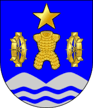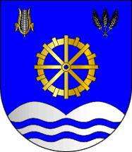 Shield parted per pale, at dexter Argent a Latin cross patty Gules voided, at sinister a representation of (and here we go) of a local landscape showing on a grassy ground Vert a rivermill Argent garnished Sable roofed Gules, on the bank of a river Azure and in background a mountain range Argent garnished Sable against a sky Azure charged with an six point estoile Argent.