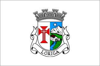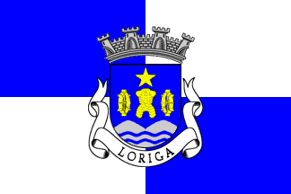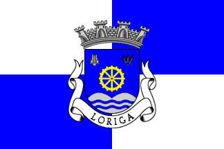 Shield Azure a cuirass (Portuguese:loriga or >lorica) Or, flanked by two watermill wheels Or, in chief a 5-point estoile Or, on a mound of two coupeaux Argent issuant from base a barrulet gemel wavy Argent. Mural crown Argent with four visible towers (town rank) and short white scroll, in Bénard Guedes style, reading in black upper case serifed letters "LORIGA".