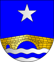 Shield Azure issuant from flanches and from base wavy Argent, charged with a barrulet wavy Azure, a hump bridge Or masoned Sable, in chief a 5-point estoile Argent.