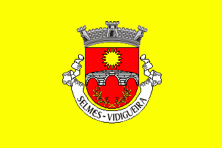 Shield Gules, divided by a 3-arched bridge Argent masoned Sable, in chief a radiant sun Or, in base two wheat ears Or crossed per saltire. Mural crown Argent with three visible towers (village rank) and white scroll with inscription in black initials: "SELMES - VIDIGUEIRA".