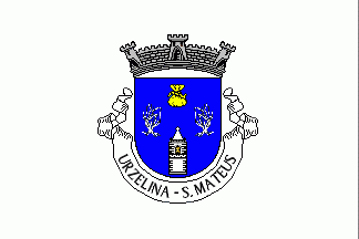 Shield Azure, on central chief point a money bag Or, on central base point a belfry Argent masoned Sable with bell, in flanches two braids Argent of broom. Mural crown Argent with three visible towers (village rank) and white scroll reading in black upper case letters "URZELINA - S. MATEUS".