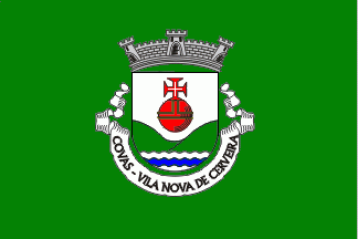 Shield Argent, a valley flanked by two mountains Vert over a base wavy of Argent and Azure, above the valley an impending orb Gules garnished Sable, the orb is crowned by a red cross patty charged with a Greek cross Argent. Mural crown Argent with three visible towers (village rank) and white scroll with inscription in black initials: "COVAS - VILA NOVA DE CERVEIRA".