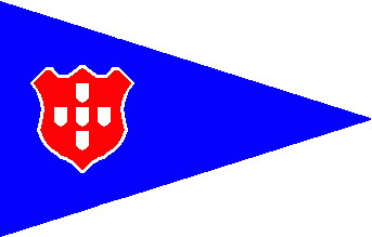 It is a blue pennant. Shifted to the hoist is a red shield fimbriated white and containing a five white escutcheons ordered per cross.