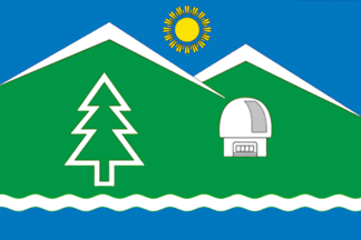 The flag is blue and depicts two green mountains, topped in snow, a wavy white base. On the mountains are a green tree outlined in white and an observatory.
