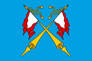 light blue, with two crossed red and white flags on yellow poles.