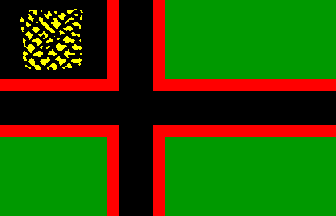 Paskov [pas94] shows three varieties of the flag. One is a Scandinavian cross flag of green field with a black cross bordered in red. This flag is simply labelled the flag of East Karelia by Paskov.