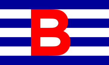 blue and three white stripes) and bears a large initial ‘B’, encroaching upon