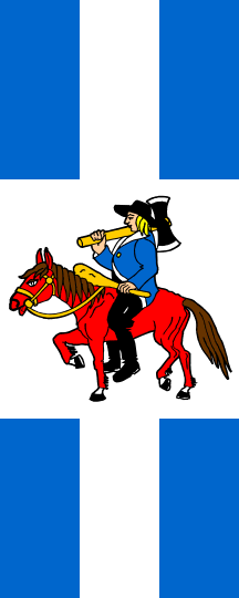 The flag of Pivka has such a white cross on a blue field, with the the horseman from the coat of arms (height = max. 9/10 min. 7/10 of the hoist size) in the middle.