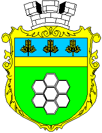 "The modern emblem has been confirmed on the 11th of December 1996 (resolution No. 1) by town council session. In a vert field there is sixfoil. In separated by or threading beem azure chief with or stripe three or pine-tree branches - in one row. The azure color of the chief symbolizes cleanliness of nature, three branches symbolize the woods among which the town was situated. The or stripe (1/7 from the height of the shield) means sands on which the town stands. A sixfoil is a fragment of a nuclear reactor VVER - 1000 of Khmelnyts'kyi nuclear power-station which consists of seven six-edged cassettes."