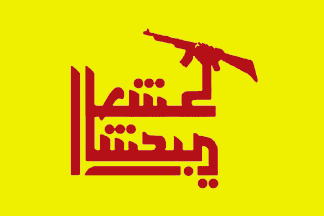 Hmmmm, yellow Hizbollah flag in background. The Green flag seems to have image of Iraq border, with a Lebanon flag. Maybe an ISIS variety?